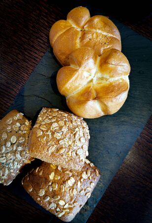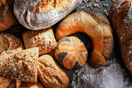 Fresh loaves of bread and buns in rustic bakery, baked goods on rustic background and countryside food market concept