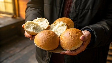 Baker holding organic bread bake bread rolls divided in half in hands - rural bakery, moody still life.