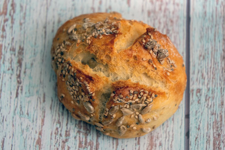 Multigrain bread roll with seeds resting on clean white backdrop. Simple aesthetic highlights texture and freshness. Concept of bakery, healthy eating, food photography.
