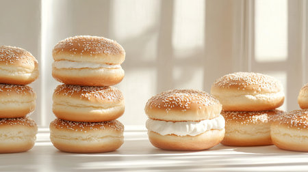 A vibrant display of fresh sesame seed buns arranged in a geometric pattern. These soft, golden buns are perfect for a variety of culinary creations.