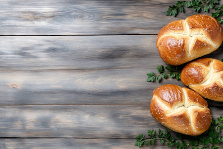 AI Generated. Freshly baked golden brown bread rolls on wooden board
