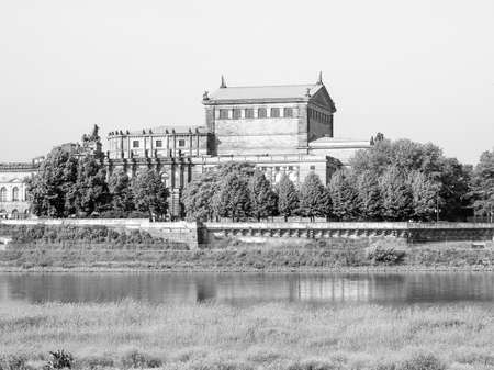 The Semperoper opera house of the Saxon State Orchestra aka Saechsische Staatsoper Dresden was designed by Gottfried Semper in 1841 in black and white