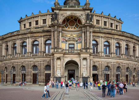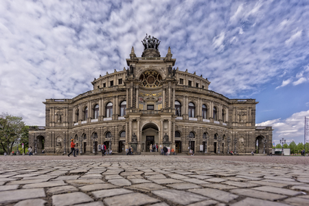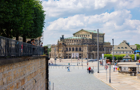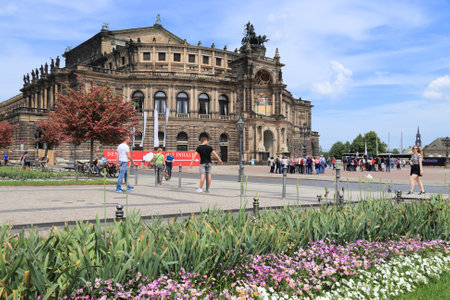 DRESDEN, GERMANY - MAY 10, 2018: People visit Semperoper (Opera House) in Altstadt (Old Town) district of Dresden, the 12th biggest city in Germany.