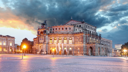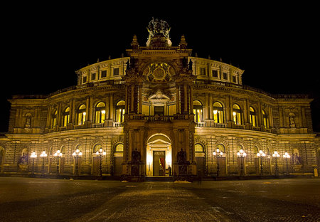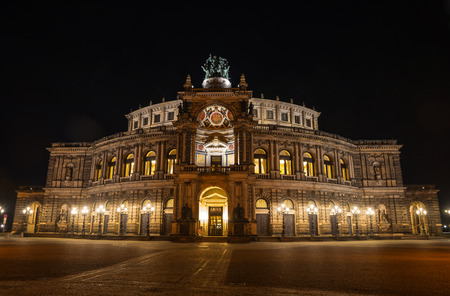 Front view of the Semperoper (Opera house) in Dresden at night, home to the ballet and the Saxon State Orchestra.