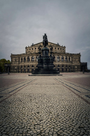 Dresden, Germany - September 23, 2020: Semperoper, famous opera house and Equestrian statue of King Jan Wettin located on Theater Square near the Elbe River in the historic center of city
