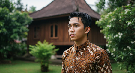 Portrait of a young Asian man in traditional clothes standing outdoors.