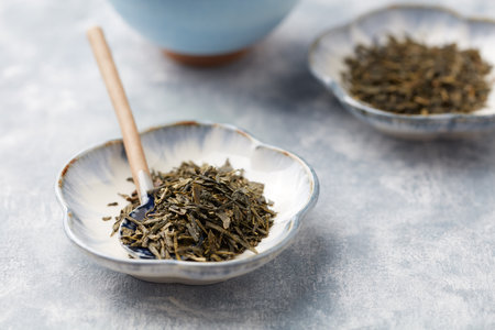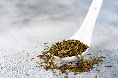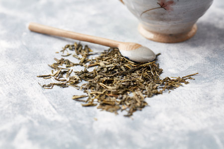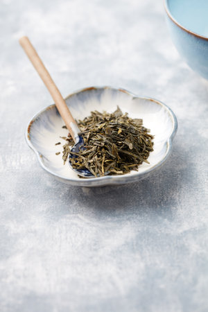 Dry green tea leaves in a bowl with a spoon on a light background.