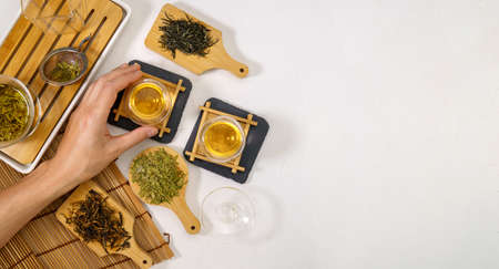 Chinese green tea loose leaves tasting selection wooden tray on table with three cups for drink tasting. Japanese matcha, royal white peony, butterfly jasmine from Fujian province