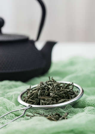 Strainer infuser with loose green organic tea on green cloth with black Japenese iron teapot.