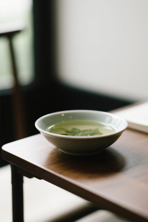 A rustic bowl holds green tea, illuminated by soft natural light. Shadows from nearby plants add depth, creating a calming and serene environment perfect for relaxation.