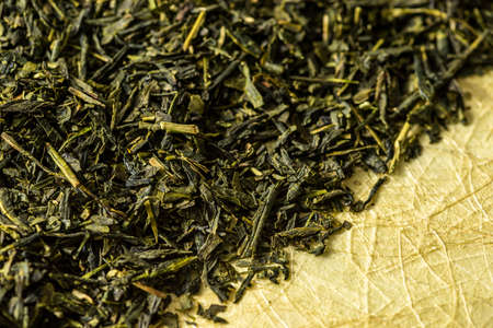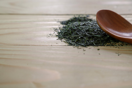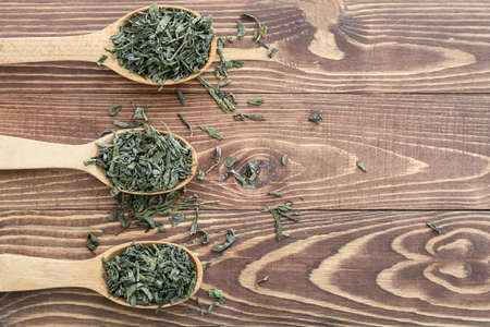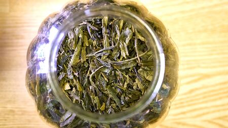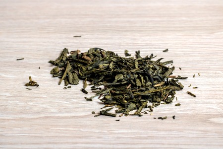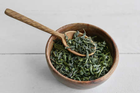 Sencha japanese dried green tea leaves in a wooden dish close up