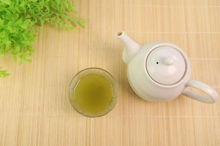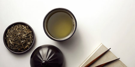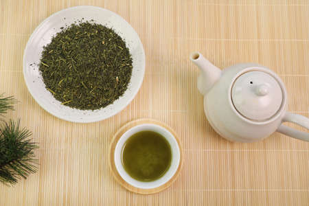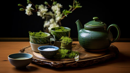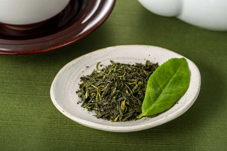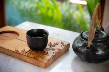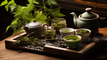 Traditional Japanese Tea with Green Leaves and Black Ceramic Teapot