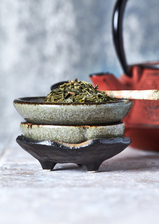 Traditional green tea in a ceramic dish on a stone background. Selective focus.