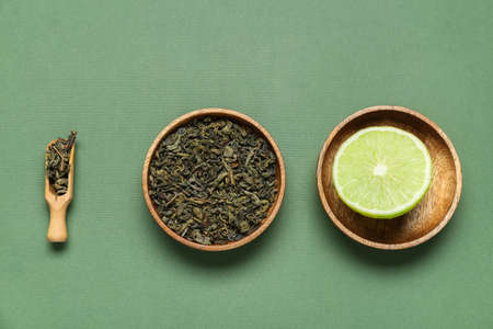 Bowl with dried tea leaves and half of ripe bergamot fruit on green background