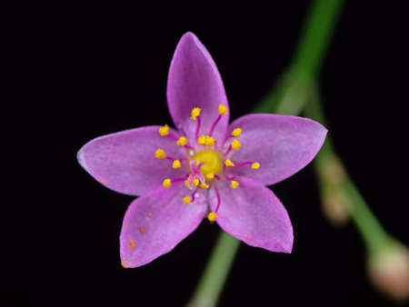 Macro Photography of Tiny Purple Flower with Yellow Pollen Isolated on Black Background, Selective Focus