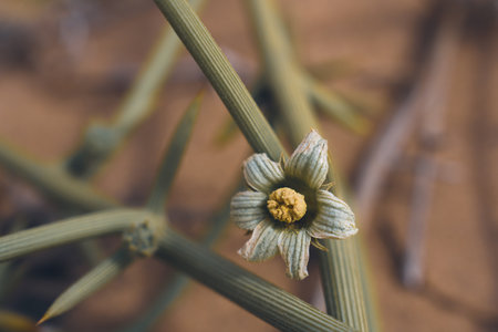 Yellow flowers bloom on a sandy beach near the ocean