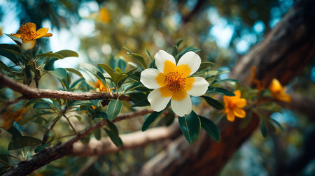 Exotic flower blossom on a textured tree branch in nature