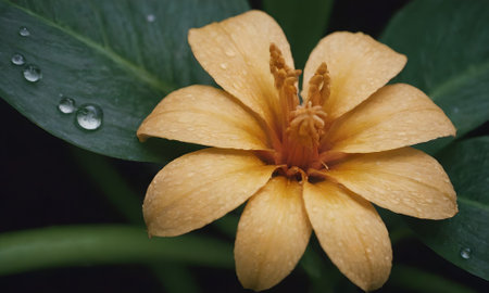 Yellow flower with raindrops on green leaves background. Close up.