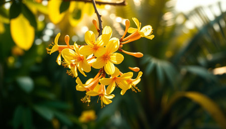 A beautiful close-up of yellow blossoms hanging gracefully from branches, bathed in soft natural light. This serene image encapsulates the beauty of nature.