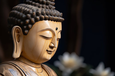 Wooden buddha statue with lotus flower in the background