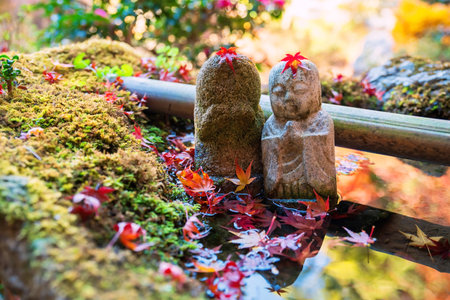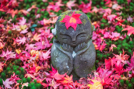 Jizo smiling Buddha statue with red maple leaf with orange heart shape on head at Enkoji temple garden, Kyoto, Japan. Famous travel destination of Rinzai Zen Buddhist sects in Kansai at fall.