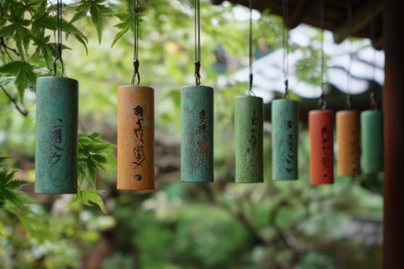 Colorful japanese wind chimes hanging in a garden with kanji characters