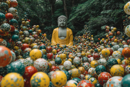 A tranquil Buddha figure sits amidst a dense collection of brightly colored, patterned orbs, creating a visually striking spiritual landscape within a verdant woodland environment