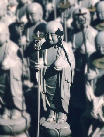 Rows of old buddhist monk traditional small statues in Japan