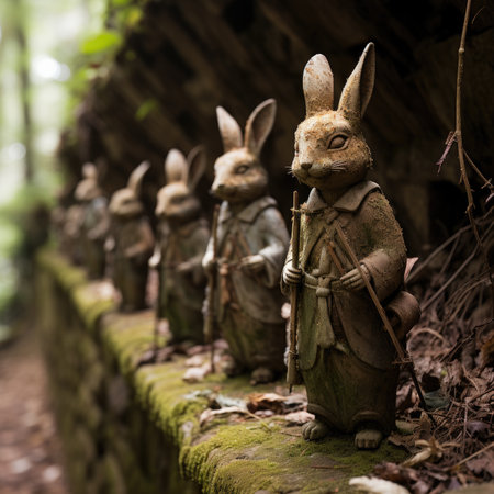 A serene garden scene features a mossy stone statue encircled Nov 23 2025