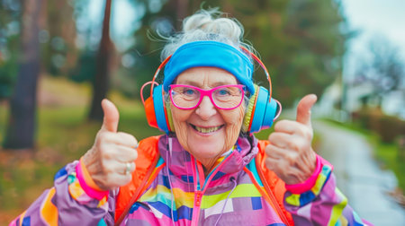 A Senior Womans Joyful Groove, Headphones On, Feeling the Beat, Positive Energy, and a Big Smile.