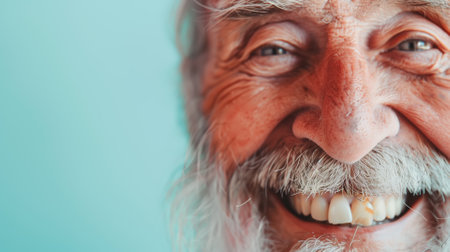 An elderly man with gray, tousled hair shows a joyful smile. His blue eyes reflect warmth and kindness, and deep wrinkles on his face tell a story of a life lived fully.