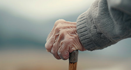 An elderly person's hand grips a wooden walking stick, highlighting the wrinkles and age spots that come with time.