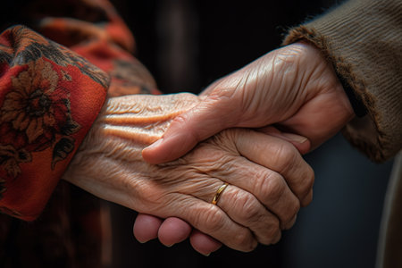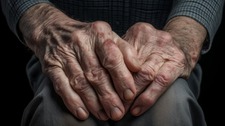 Aged and youthful hands intertwined, showcasing the beauty of connection and love, with textures of skin and fabric creating a warm, intimate atmosphere