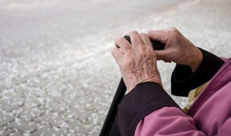 Close up on hands of unknown old caucasian man pensioner senior holding cane walking stick while sitting and waiting - real people old age senility concept copy space