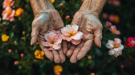 A Close up of wrinkled hands holding pink flowers, symbolizing beauty and wisdom in graceful aging