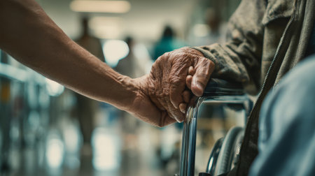 Elderly hand holding caregiver hand in hospital hallway offering comfort and compassion, warm supportive connection between patient and nurse