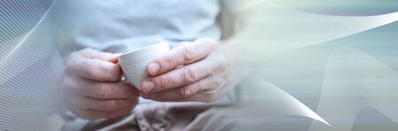 Man sitting outdoor holding a cup of coffee; panoramic banner