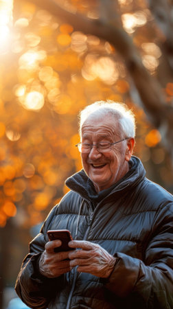 Joyful senior man using smartphone in autumn park with fallen leaves on the ground