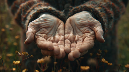 Elderly hands reach out gently, surrounded by vibrant flowers, reflecting a poignant need for social assistance and community care