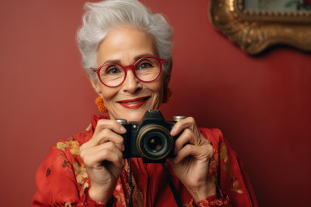 A joyful senior woman with short white hair wearing red glasses and a matching red outfit holds a camera. She stands against a matching red background, smiling warmly