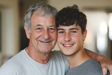 Grandfather and granddaughter smiling together, sharing a happy family moment