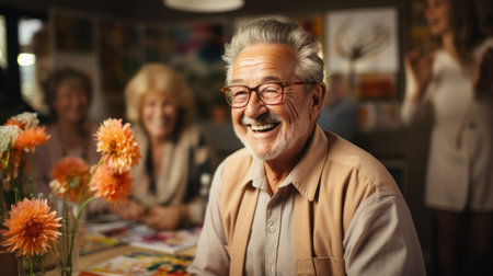 Portrait of smiling senior man in eyeglasses looking at camera while painting in art studio. Generative AI.