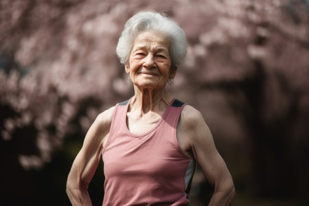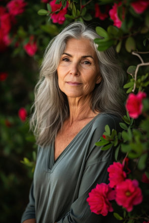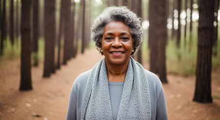 Smiling senior woman standing confidently among tall trees in a serene forest, exuding calmness, wisdom, and peaceful energy.