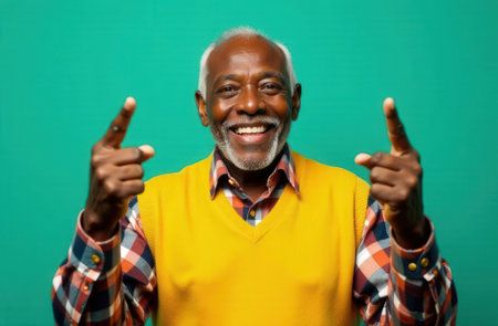 Joyful african american man with gray hair is smiling broadly while pointing with both hands, showcasing a vibrant personality against a bright green background, radiating positivity and energy