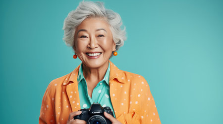 Portrait of an attractive cheerful gray-haired woman having fun, isolated on a bright turquoise background with a camera