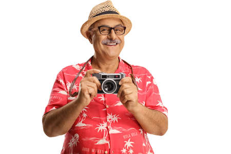 Everyone photogenic. Senior man taking selfie photo vintage camera. Self portrait. Memories in snap. Retro equipment for taking photo. Sharing his knowledge making good photo. Imitate fashion trends