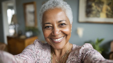 A joyful woman with silver curls captures a moment of happiness and warmth in her home.