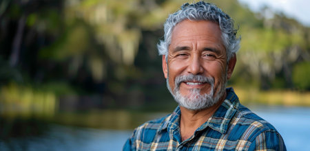 A thoughtful older man stands still, exuding wisdom and strength. His weathered features embody a life filled with experiences, while sunlight gently highlights his serene expression.