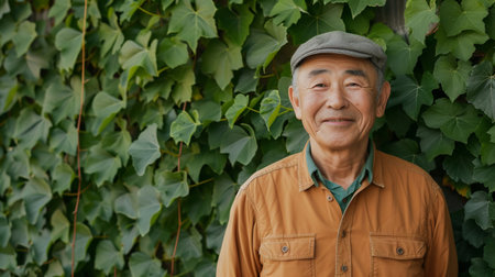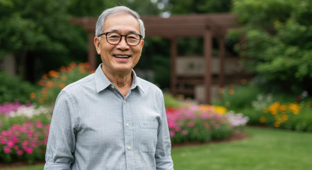 Smiling Retired East Asian Man in Glasses Standing in a Peaceful Flower Garden