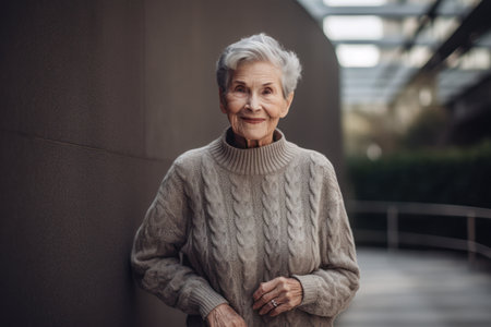 Portrait of a happy senior woman in a gray sweater standing outdoors.